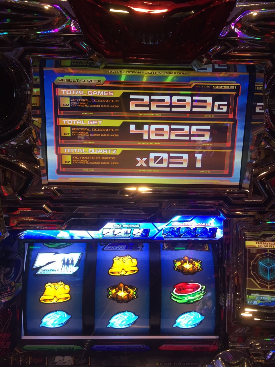21時前にクオーツなんちゃら中に中チェからフリーズひいて閉店15分前に終わって2700枚でたわ