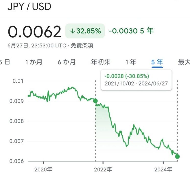 分かり易い例を挙げよう、1991年と2024年同じ為替1ドル160円な
