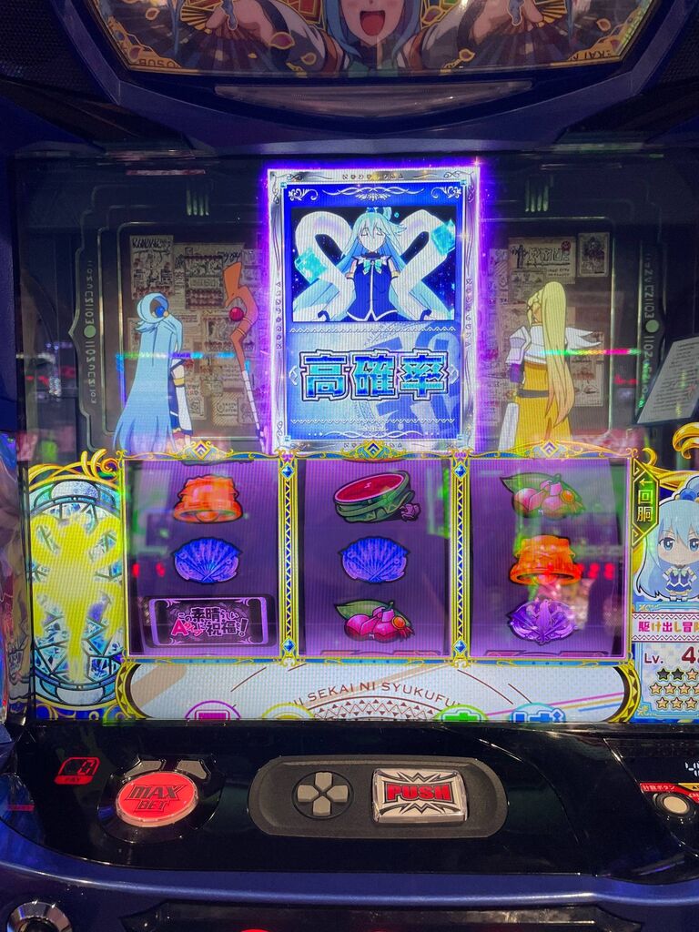 なぜか駄女神出てきたけど、今のところ判別は逆押しで赤7orREG2種で2G、中押し黄or青狙って右リール上段青をそれぞれやって、最終的に4Gかかるかな?